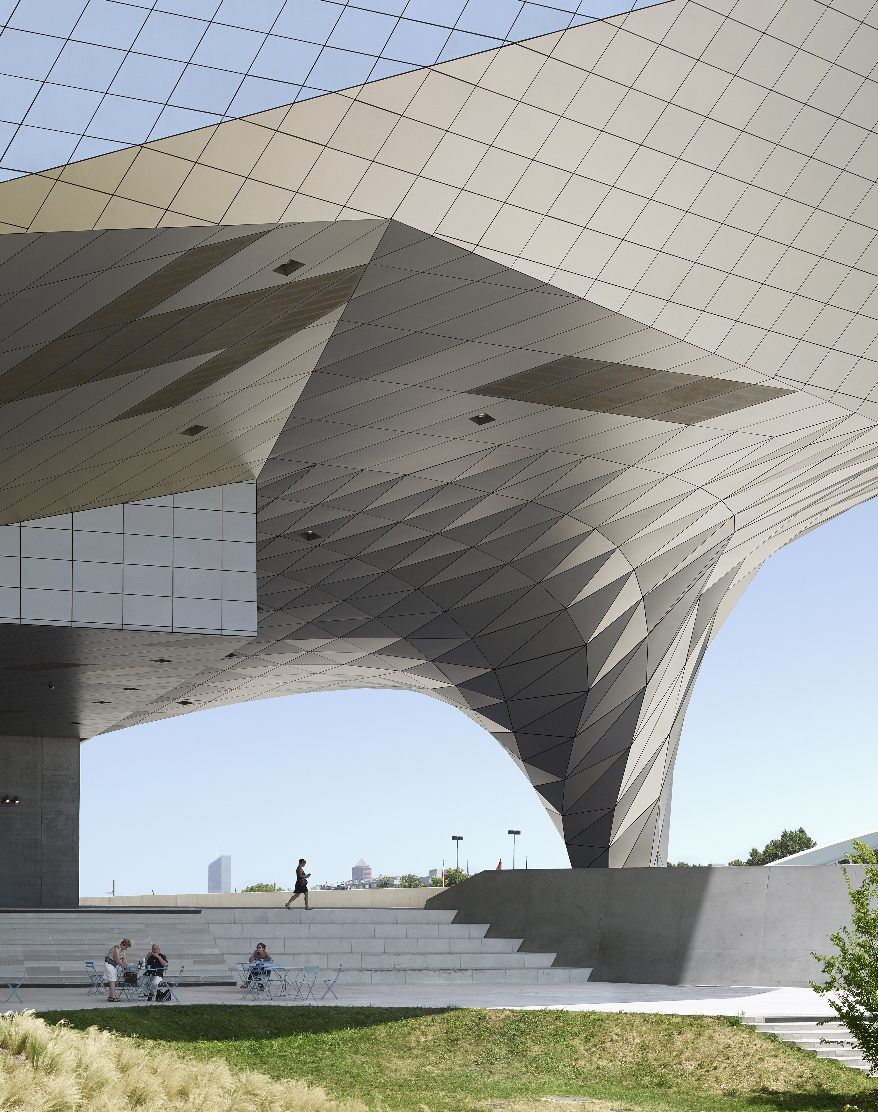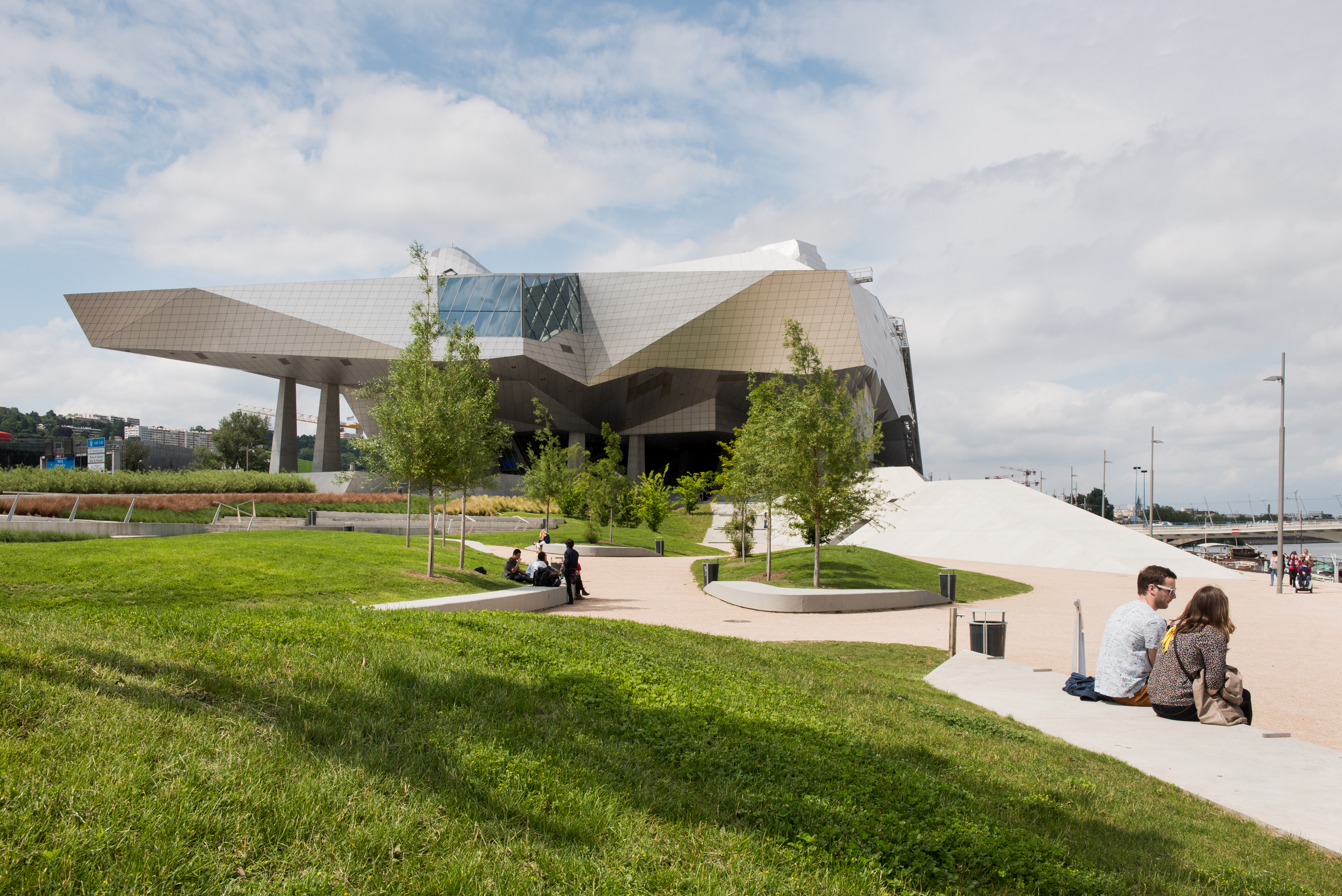 Les volontés de l’agence d’architecture autrichienne Coop Himmelb(l)au ont été difficiles à mettre en œuvre, notamment parce que le musée est construit sur des alluvions, à la confluence entre la Saône et le Rhône, sur l’emplacement d’une ancienne usine à gaz. Il a fallu creuser pour dépolluer et trouver les bases solides afin d’accueillir un bâtiment de 22 000 mètres carrés.