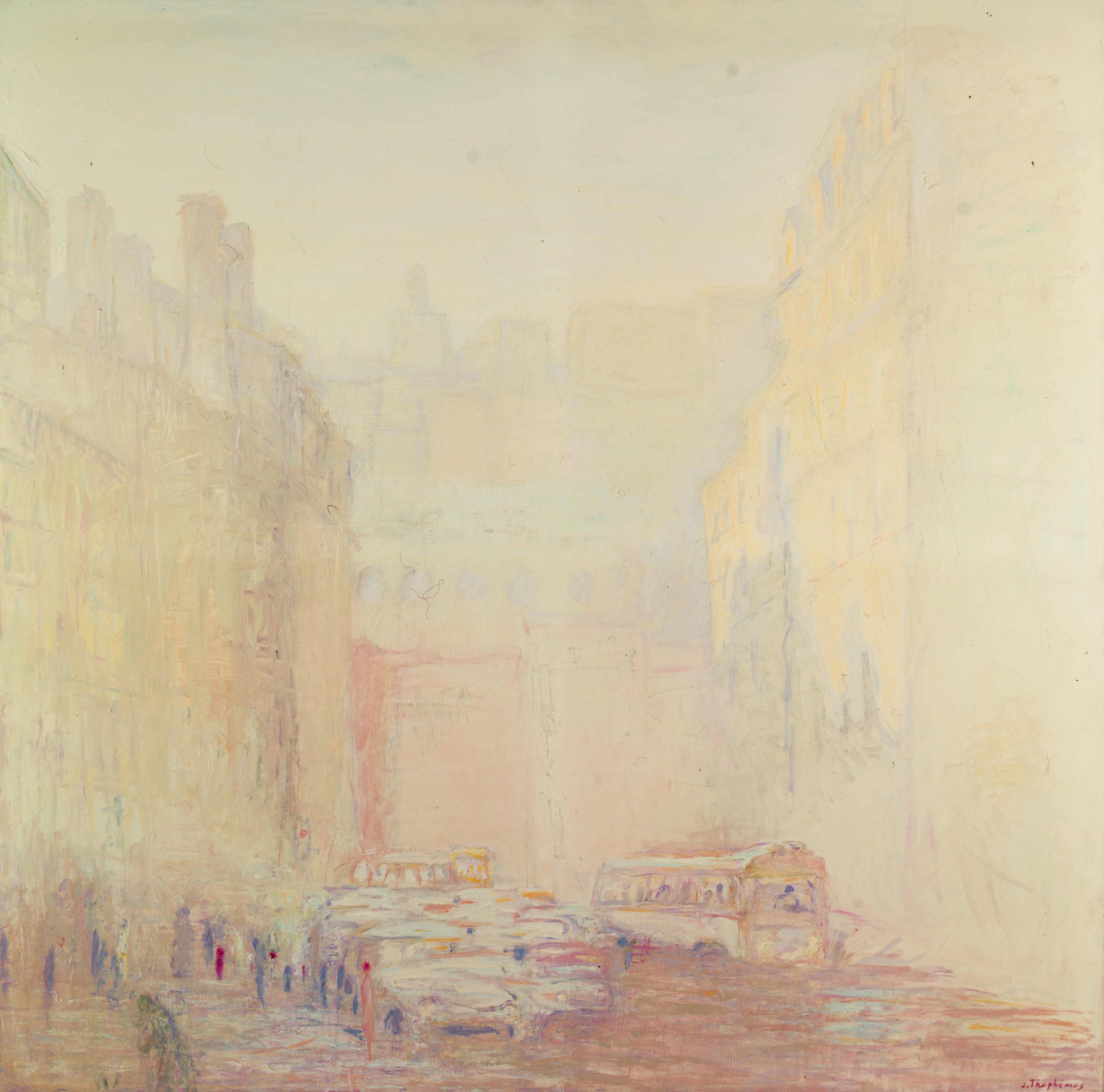 Durant les années 80, Jacques Truphémus dévoile son rapport intime avec la ville de Lyon, dont il ne cesse de peindre les rues et les cafés. Il utilise la vitre comme un écran entre l’intérieur et l’extérieur et permet de dédoubler les plans grâce à ses reflets. Les personnages ,à l’intérieur des cafés, apparaissent à contre-jour. Sa peinture se caractérise par un style dépouillé.