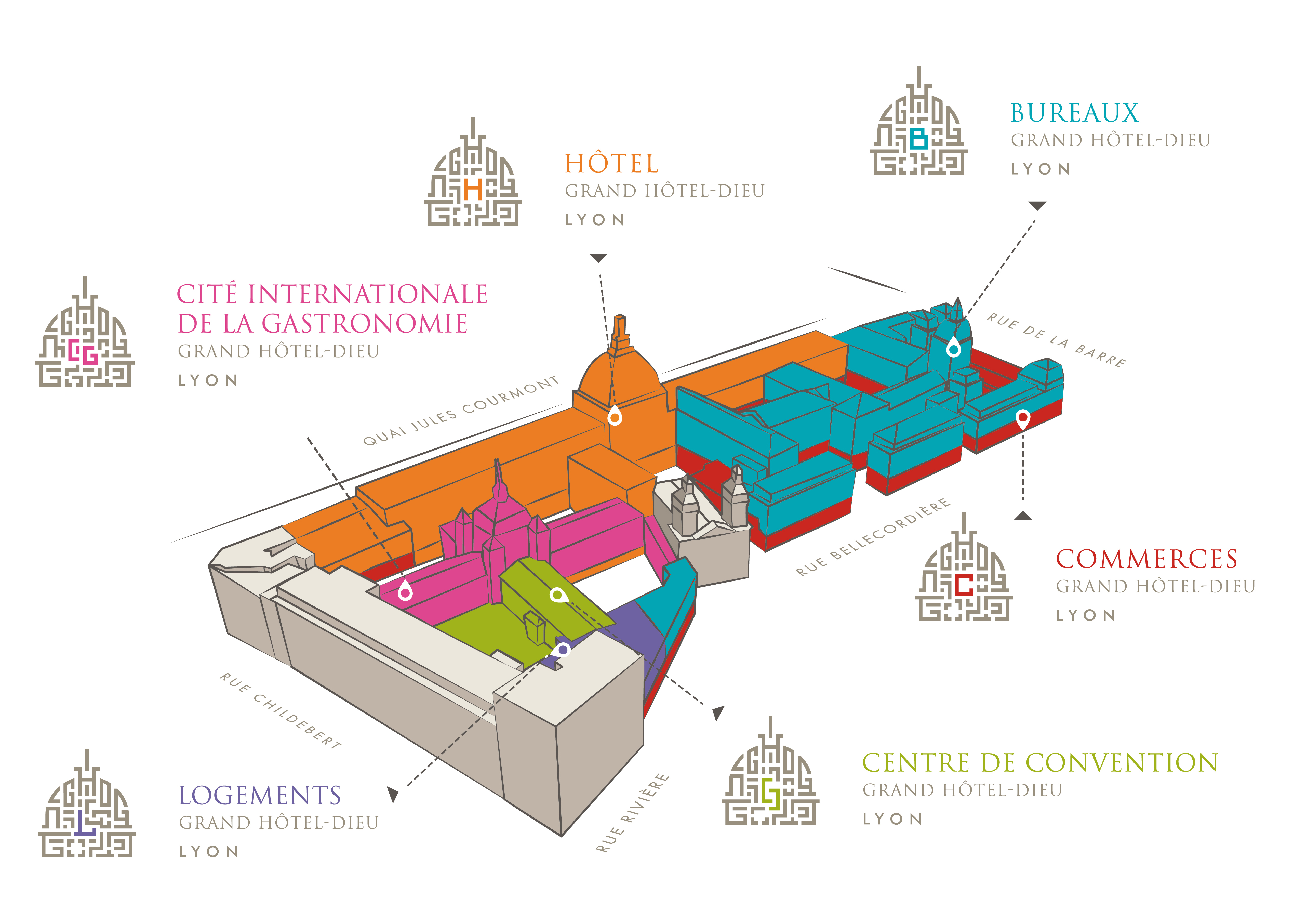 Répartie sur 4 niveaux, la Cité de la Gastronomie s’installera sur la partie la plus ancienne de l’Hôtel-Dieu, dans le dôme et les quatre ailes de bâtiments qui s’ouvrent sur l’actuelle place de l’Hôpital. Cette dernière sera le point de départ d’une série de passages, de places où flâner et faire du shopping.