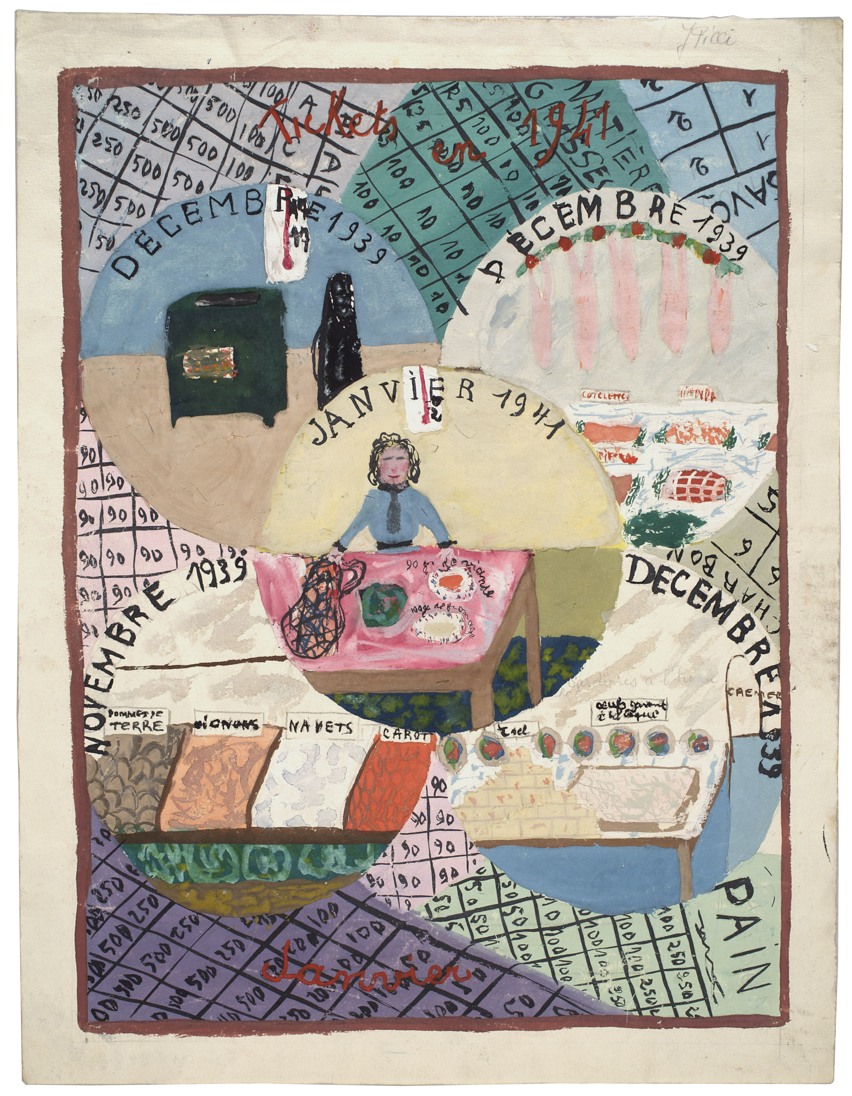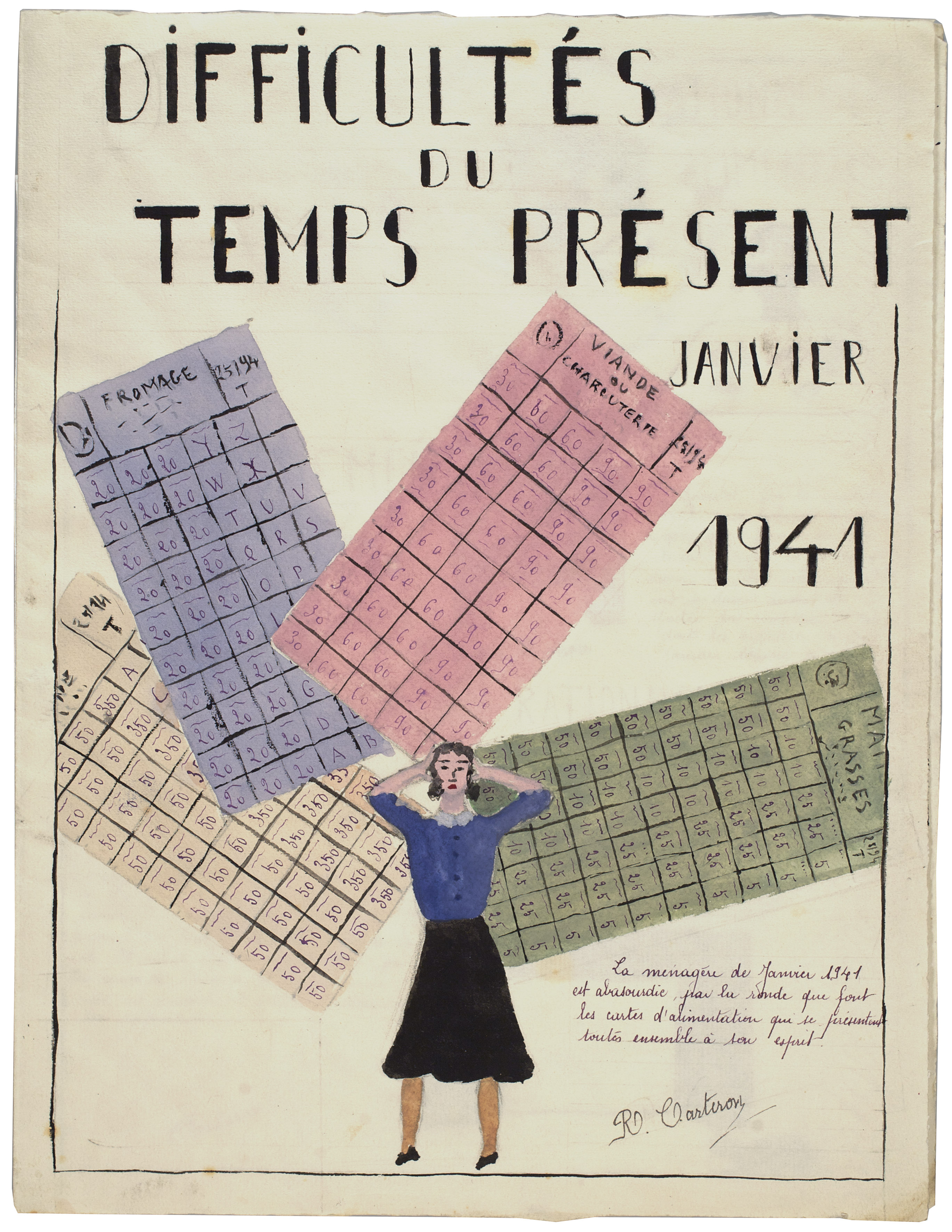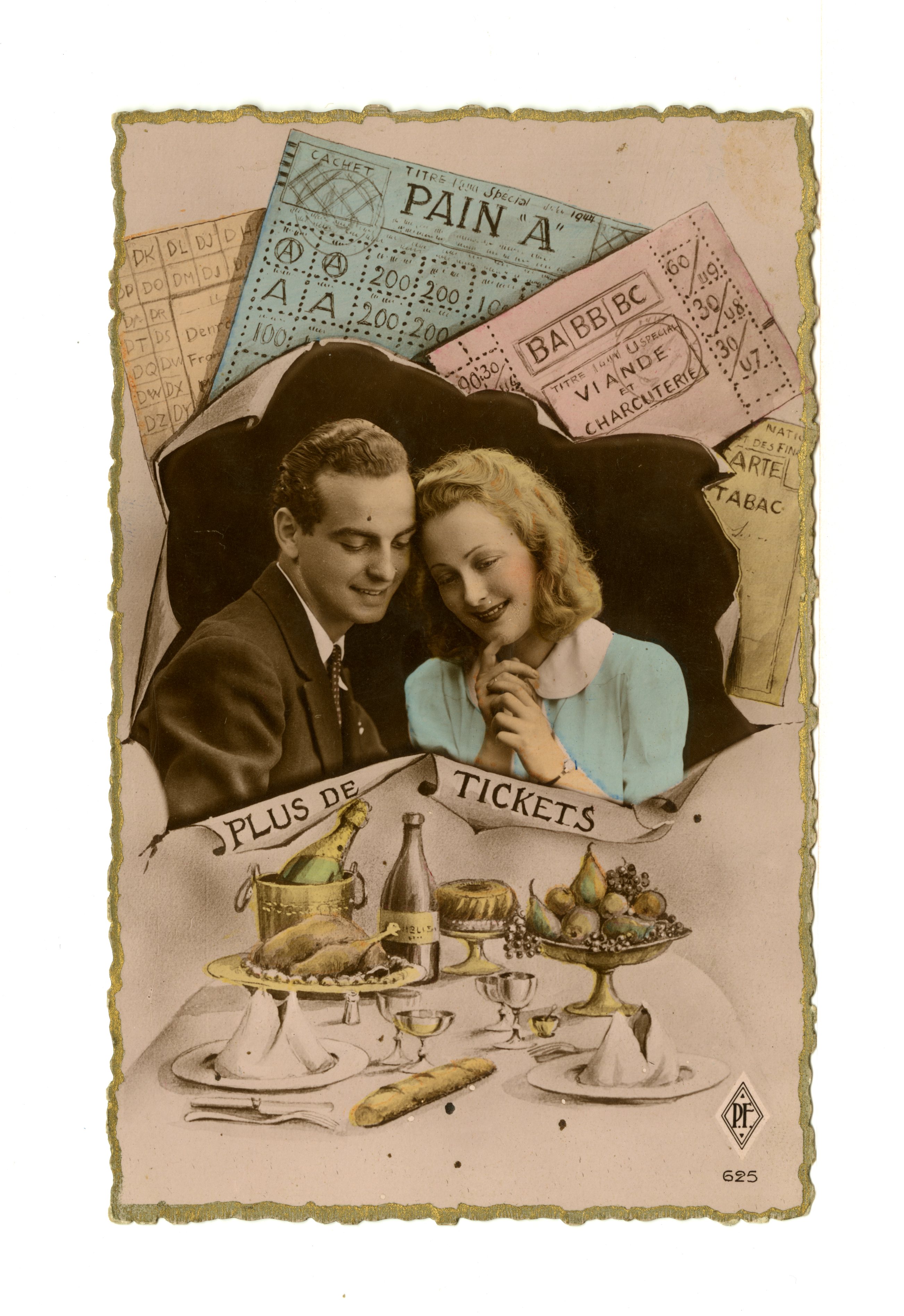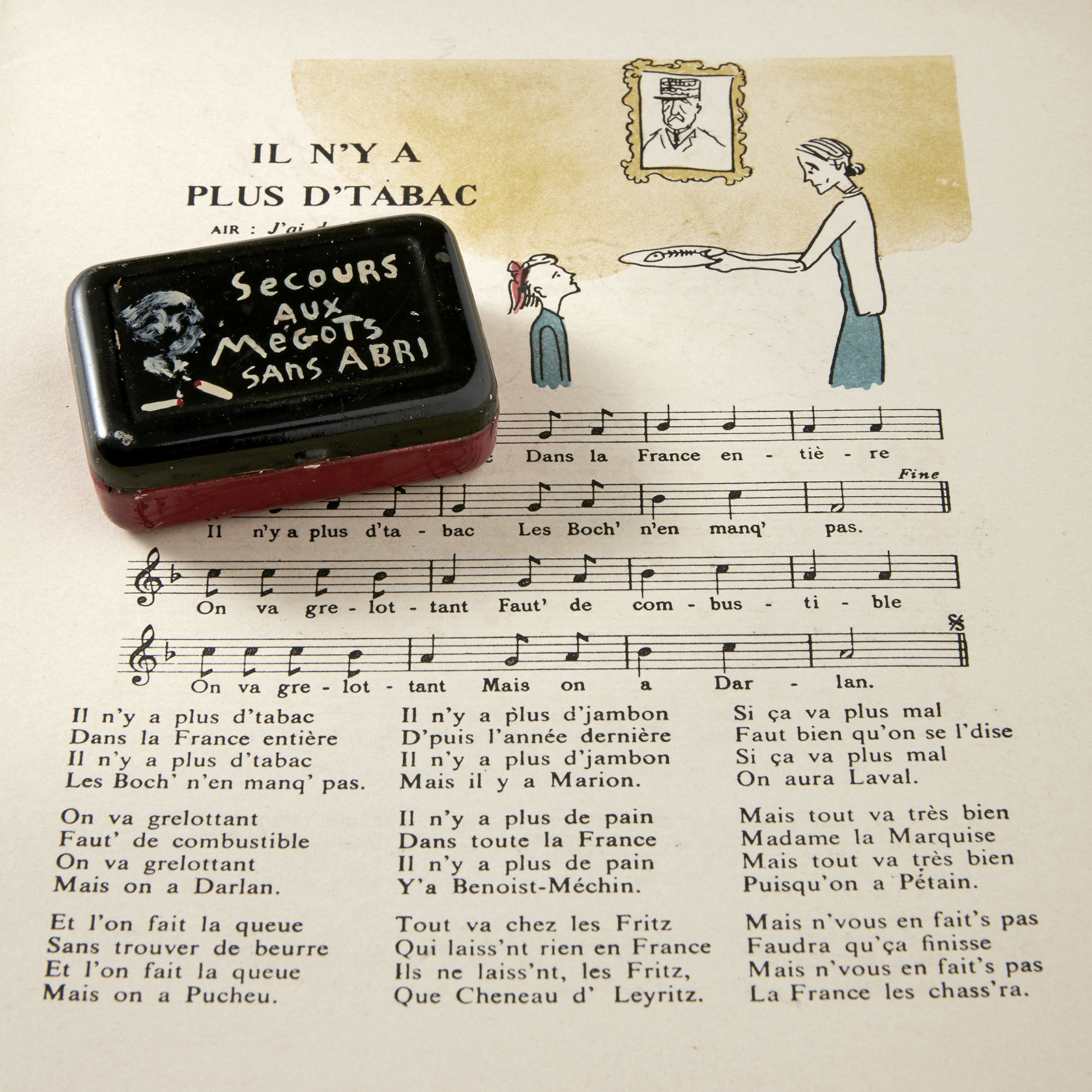 Alors, pour faire face à la pénurie, Il faut bien trouver des alternatives. Rutabaga et topinambour deviennent alors célèbres dans les assiettes des Français. Des marchés roses sont mis en place, ce qui permet aux familles habitant la campagne d’envoyer des colis de nourriture aux membres de leur famille habitant en ville. Marché noir et troc sont aussi présents. Photos, coupures de presse, lettres, objets divers, etc. viennent illustrer ces explications. Et contrairement à ce que l’on pourrait croire, les jours sans ne sont pas pour autant dénués d’humour. C’est même un paradoxe frappant : pour oublier les restrictions, les français se précipitent dans les salles de spectacles. Les chansonniers détournement également des chansons populaires avec de nouvelles paroles comme sur un air de J’ai du bon tabac. Jeux, journaux, dessins, lectures, etc. le divertissement n’avait pas été complètement rayé de la vie des gens.