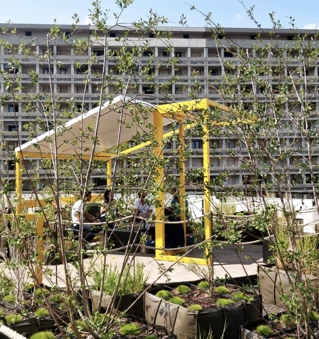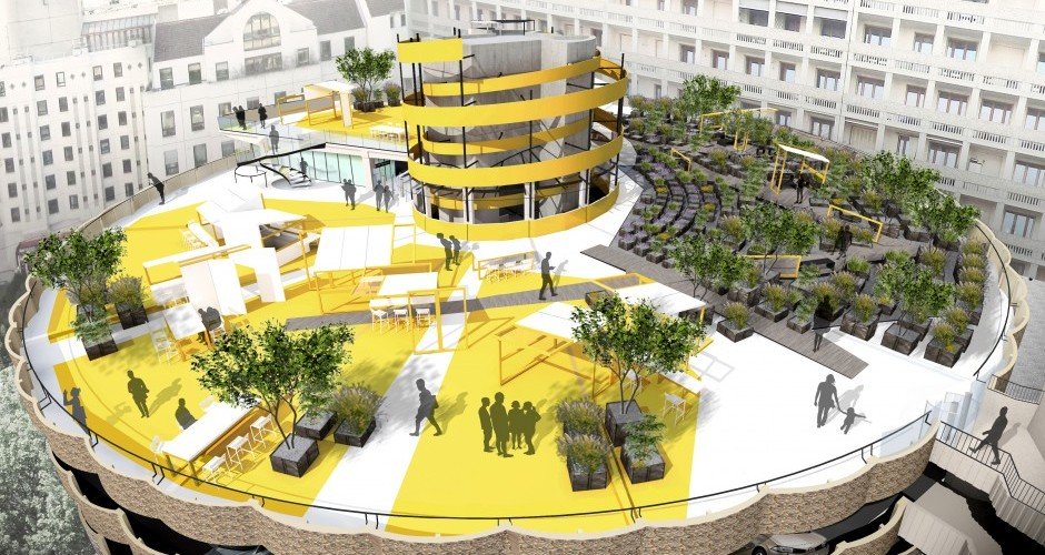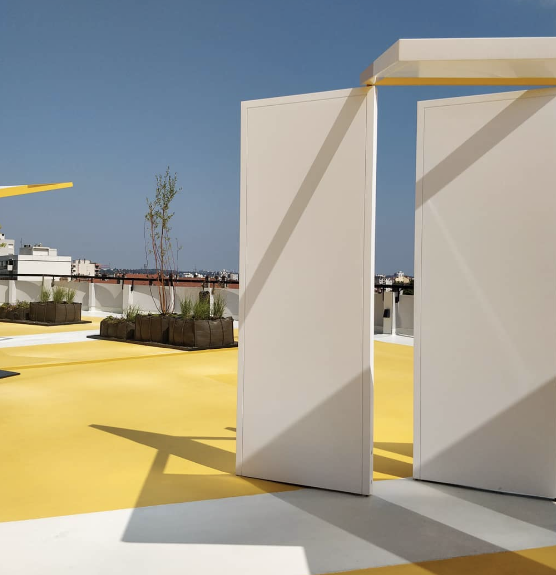 Le Rooftop est parcouru par des lignes jaunes et des verrières. Il apporte une touche de fraîcheur bienvenue dans ce quartier urbanisé. Au sommet l’oeuvre centrale de l’artiste Mengzhi Zheng est entourée d’un petit jardin aménagé d’une buvette, pour se détendre un belvédère pour les amoureux des photos urbaines.