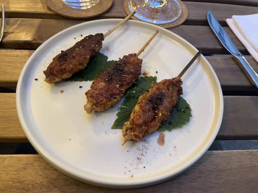 En entrée, trois brochettes Tsukune, shiso et citron exallent des saveurs exotiques, une cuisson parfaite dosée pour un résultat très tendre.