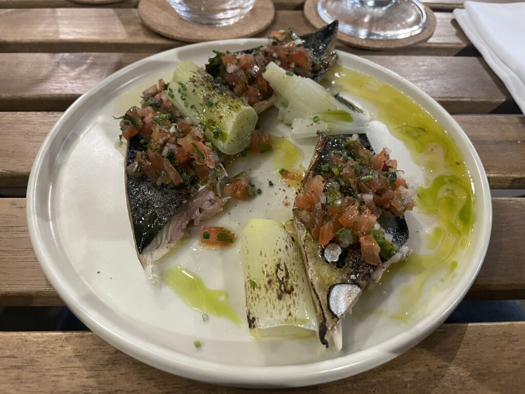 Nous n’avons pas regretté notre choix : le maquereau à la flamme et ses poireaux, relish tomes et herbes, garum. Un délice, le poisson-demeure cuit à point, les saveurs fumées rehaussent le produit maitrisé à la perfection.