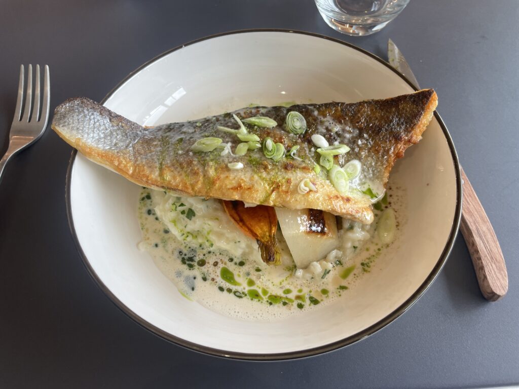 En plat principal, le filet de bar est tout aussi remarquable, relevé par un beurre blanc à la sauge et un caramel de bisque, le tout servi avec un risotto crémeux au parmesan.