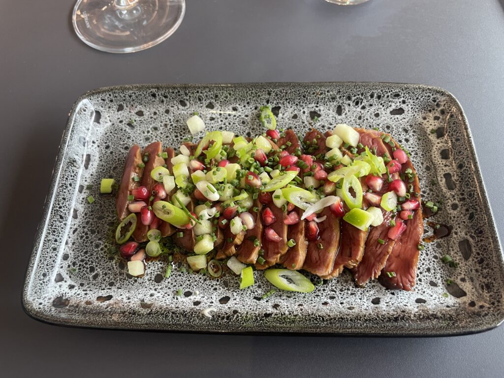 Tataki de canard mariné, perles de grenade et cives croquantes