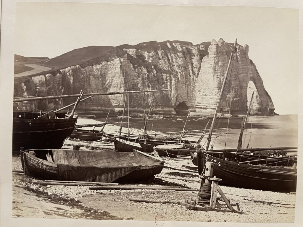 À l’étage, des photographies en noir et blanc offrent un autre regard sur ces paysages. Alors que le procédé reste récent, les paysages normands deviennent le sujet de prises de vue par les pionniers de la photographie sur papier. Les auteurs sont souvent des bourgeois fortunés ou des aristocrates en villégiature.