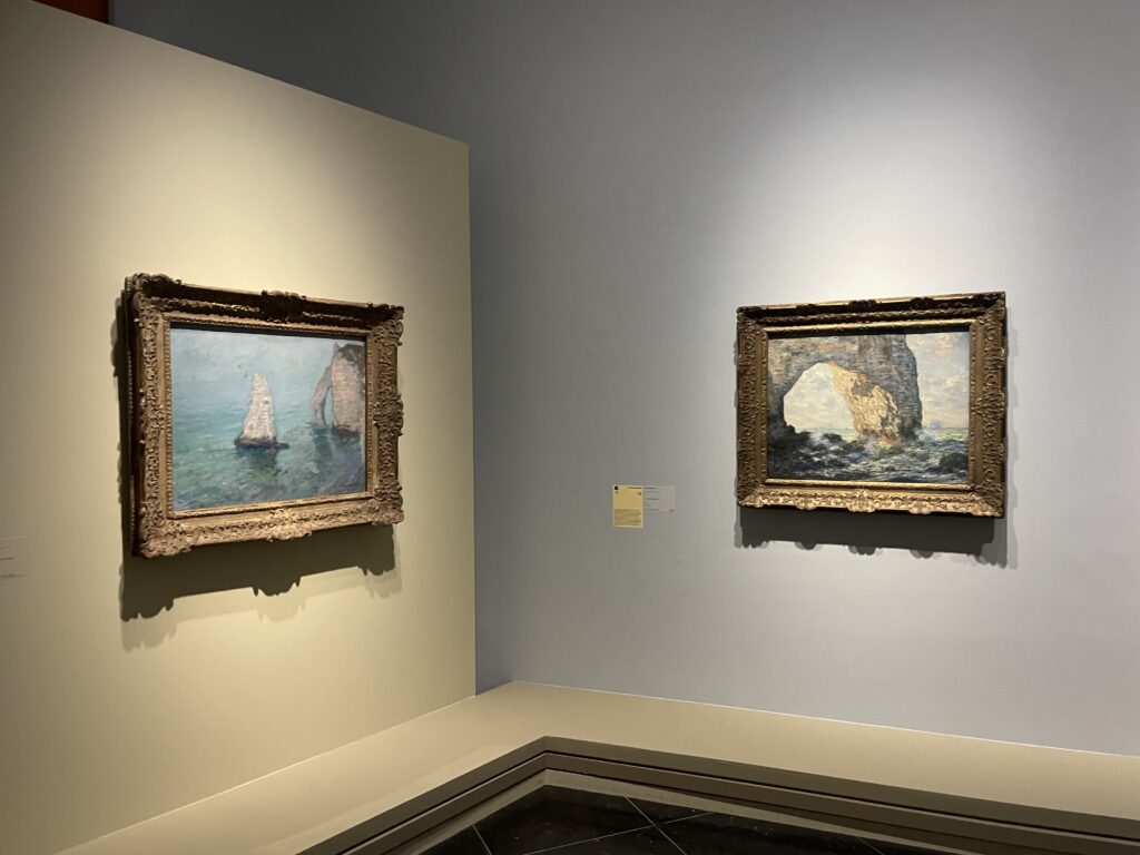 La scénographie met d’emblée à l’honneur le sujet avec, fait rare, une projection grand format dédiée aux falaises. Le village d’Étretat se niche dans une étroite vallée creusée dans la falaise, débouchant sur une plage de galets. L’érosion y a sculpté des formes spectaculaires : trois arches s’ouvrant successivement sur la mer et une aiguille. Ce paysage exceptionnel s’est imposé dans l’imaginaire collectif grâce aux artistes. Peintres et écrivains ont en effet largement contribué à la découverte et à la notoriété d’Étretat.