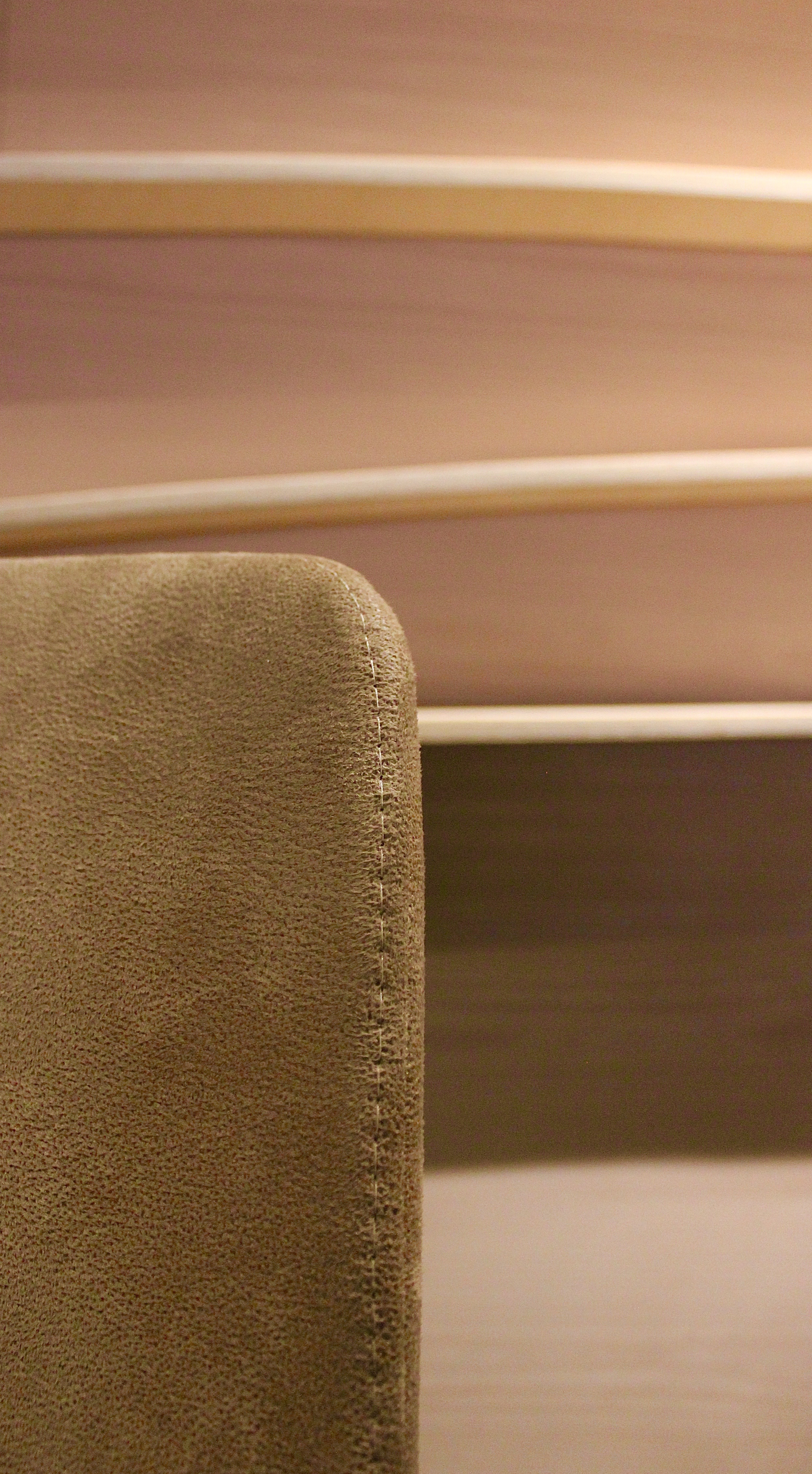 Le décor tout en volutes se révèle propice à la décontraction. Le mur face à l’entrée a été pensé comme un arbre: une porte déguisée en tronc, un plafond aux courbes mimant un feuillage trop grand qui dépasserait sur l’extérieur et çà et là, ain,si que des branches d’arbres disposées dans la salle.
