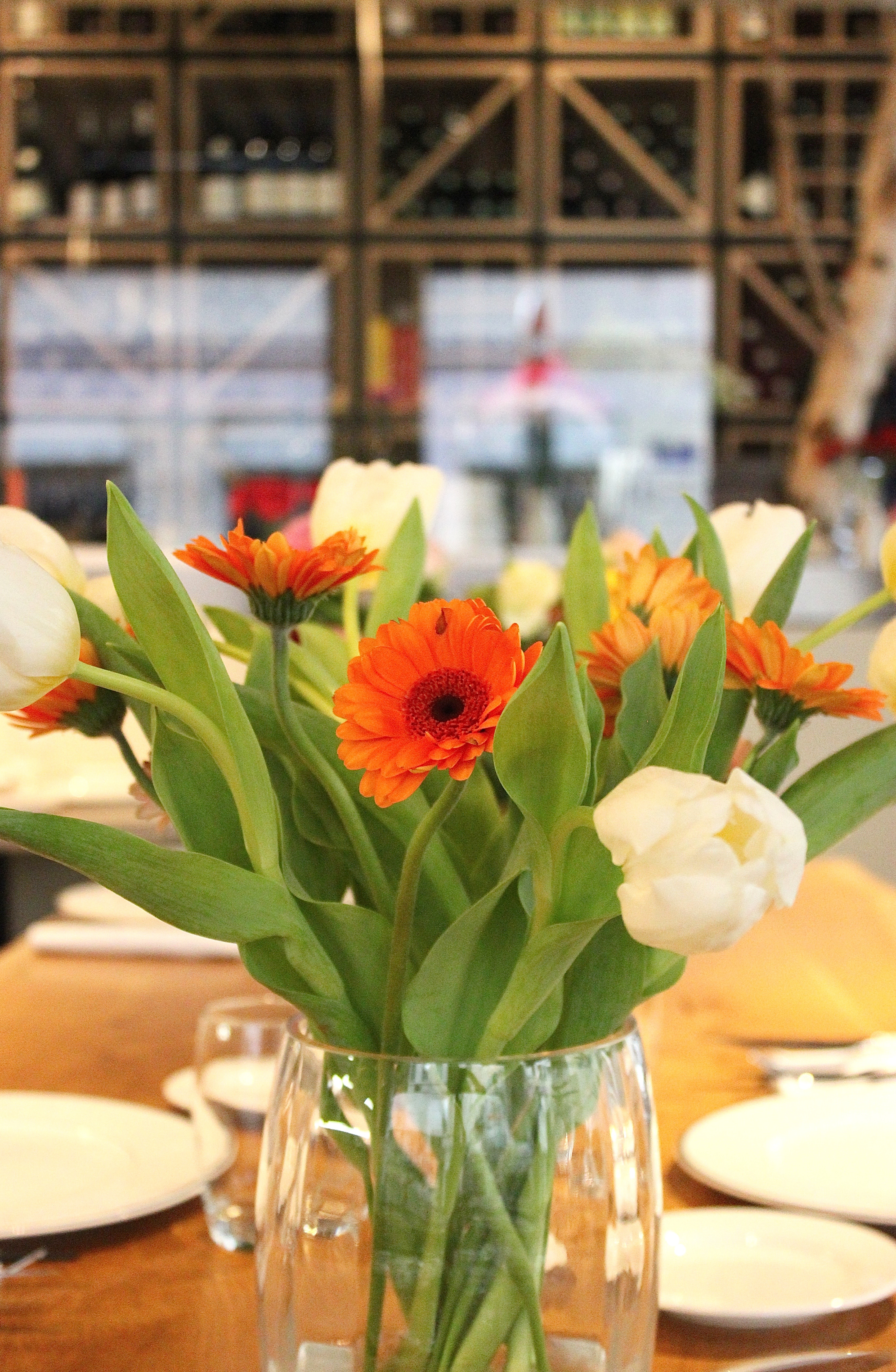 Une grande table d’hôtes en chêne trône au milieu de la pièce, des bouquets colorés disséminés apportent des notes chatoyantes.