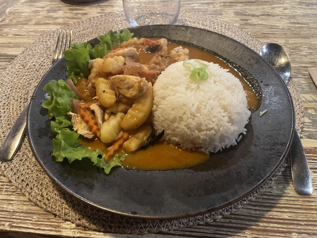 Nous avons débuté par une salade som tam, papaye verte et crevettes, parfaitement équilibrée. Le plat principal mêlait habilement poulet, pomme de terre, piment et anis étoilé.