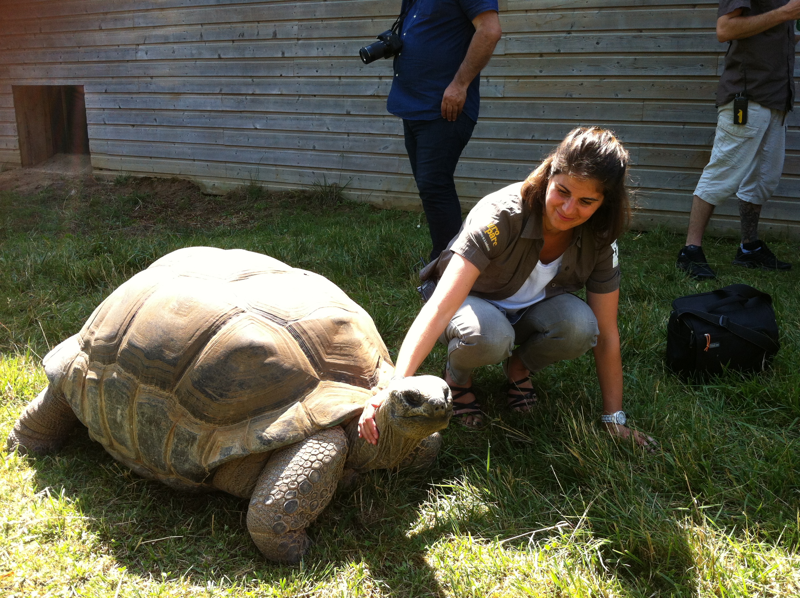 Touroparc.zoo, c’est aussi la découverte d’espèces qui nous seraient inconnues, ou que l’on connaît, mais que nous n’avons jamais vues en vrai. Les reptiles sont des animaux bien mystérieux pour nous. La tortue géante d’Aldabra est la plus grosse tortue terrestre avec la tortue des Galàpagos. Elle peut peser jusqu’à 300 kg et sa carapace peut atteindre 1,20 m de longueur. Connut aussi pour sa durée de vie qui peut aller jusqu’à 150 ans, le parc en accueille deux, un mâle et une femelle. Ici la femelle est plus petite que le mâle, mais ce n’est pas toujours le cas, elle fait attention à sa ligne, c’est important avant l’été. Elle reste plus timide et ne se laisse pas beaucoup approcher. Mais pour Aldo, le mâle, c’est tout autre chose ! Il adore les caresses et on le voit tout de suite lorsqu’il commence à se relever sous les caresses de certains visiteurs qui ont eu accès à l’enclos. Sa carapace est très dure et seul des moellons ou un filet peut l’arrêter. Sa peau est aussi dure et rugueuse, plus rugueuse que celle de l’éléphant, cela lui permet de se protéger de la météo dehors tout comme sa carapace. Lorsque la température extérieure dépasse les 20°C et que le soleil est présent les deux tortues se retrouvent dans l’herbe à bronzer au soleil ou à l’ombre pour les plus sensibles. De l’autre côté, nous retrouvons un python royal dans les mains d’Emanuela. Ce serpent est une espèce carnivore qui se nourrit d’oiseaux, qu’il étouffe pour les tuer et qu’il avale en entier. Le python adulte mange une à deux fois par mois alors que les plus jeunes une à deux fois par semaine. Comme tous les reptiles, leur température corporelle varie suivant la température de l’endroit dans lequel ils sont. Ici il se réchauffe dans les bras d’Emanuela. La pédagogie est quelque chose d’important pour Franck Chaduc, quelque chose qu’il ne faut pas ignorer, c’est un des points essentiels du parc et il met tout en œuvre pour conserver ce point de vue pédagogique pour les visiteurs.
